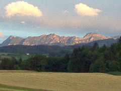 von vielen Hecken und Einzelbäumen mit Aussicht auf die Voralpen.